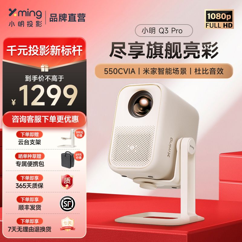 小明Q3Pro云台投影仪震撼促销来袭,现在入手超值划算!这款1080P超高清游戏投影机搭载高性能云台设计,支持自动对焦与智能梯形校正,无论卧室、客厅还是户外露营,随手一放即享清晰大屏画面。采用先进显示技术,画质细腻色彩真实,搭配高亮度光源,白天观影同样出色。内置智能系统,操作流畅,支持无线投屏与多设备连接,畅享影音游戏娱乐新体验。